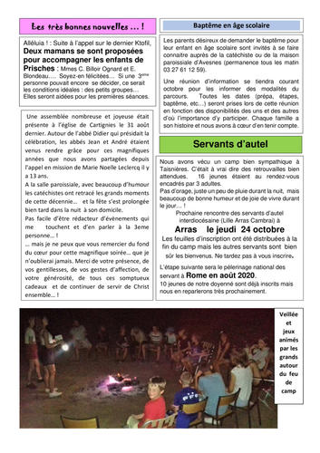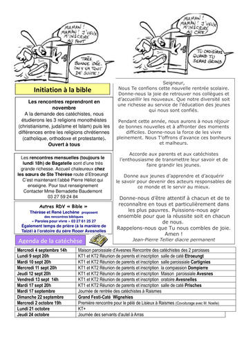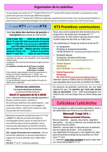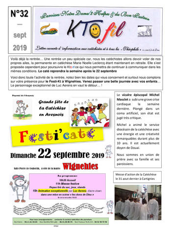 Voilà déjà la rentrée… Une rentrée un peu spéciale car, nous les catéchistes allons devoir voler de nos propres ailes, la permanente en catéchèse Marie Noelle Leclercq étant maintenant en retraite. Elle s’est proposée cependant pour poursuivre le Kto fil ce qui nous permettra de continuer à communiquer dans les mêmes conditions. Le caté reprendra la semaine après le 22 septembre